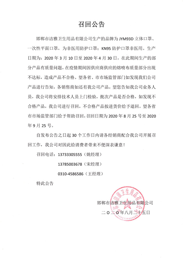 邯鄲市潔雅衛(wèi)生用品有限公司生產(chǎn)的品牌為JYM93D立體口罩一次性平面口罩,為非醫(yī)用防護(hù)口罩;KN95 防護(hù)口罩非醫(yī)用。生產(chǎn)日期為:2020年3月10日至2020年4月30日,在此期間生產(chǎn)的部分產(chǎn)品有質(zhì)量問題,在疫情期間因供應(yīng)商供應(yīng)的熔噴布質(zhì)量部分出現(xiàn)不達(dá)標(biāo),造成產(chǎn)品不合格。望各省、市市場監(jiān)管部門如發(fā)現(xiàn)我們公司產(chǎn)品進(jìn)行告知,各銷售商如還有我公司產(chǎn)品,望您告知我公司業(yè)務(wù)人員,我公司將安排技術(shù)人員上門檢驗,批次產(chǎn)品是否合格,如發(fā)現(xiàn)不合格產(chǎn)品,我公司進(jìn)行召回,不合格產(chǎn)品按進(jìn)貨價給予退回。望各省市市場監(jiān)管部門給予幫助召回召回日期為2020年8月25號至2020年9月25號